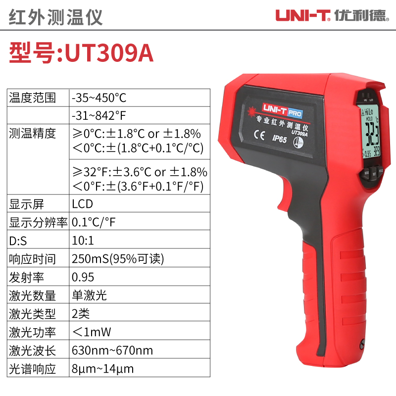 測(cè)溫范圍:-35~450℃,顯示分辨率:0.1℃,D:S:10:1,發(fā)射率0.95,激光類...