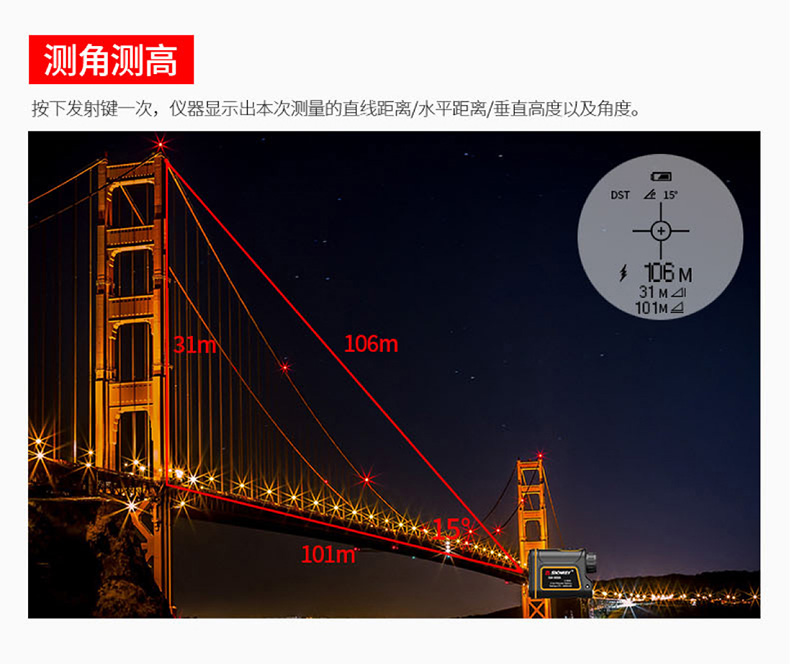 用途及應(yīng)用領(lǐng)域:廣泛用于電力設(shè)備安裝、高速公路、市政工程、狙擊手等戶外各類測(cè)量和高爾夫、狩獵等個(gè)人戶外運(yùn)動(dòng)愛好者。