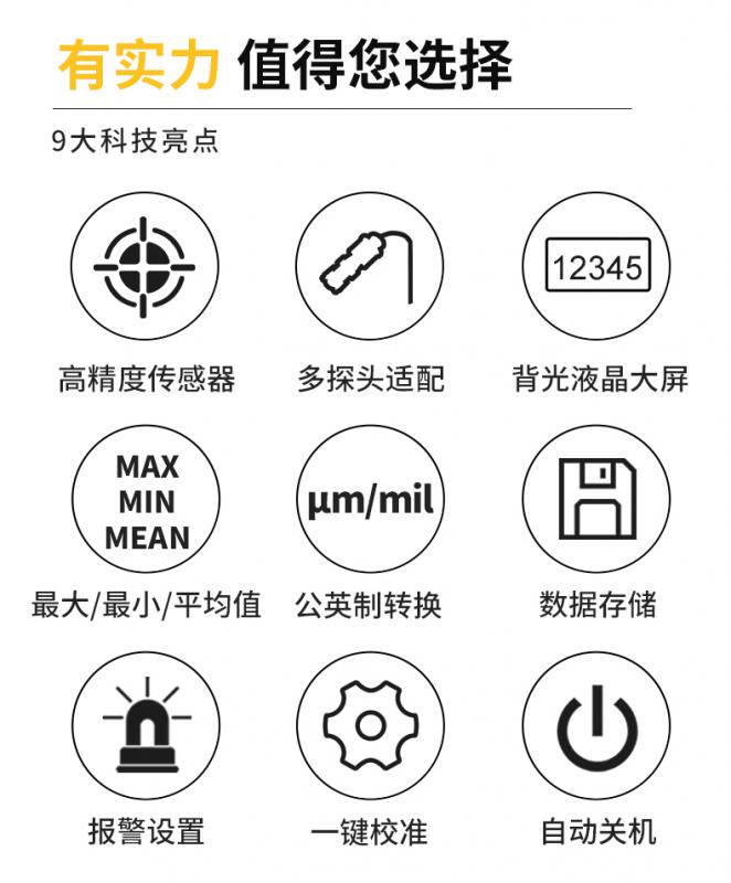 采用了磁性(標(biāo)配探頭)和渦流(選配探頭)兩種測(cè)厚方法,磁性 探測(cè)法可無(wú)損地測(cè)量磁性金屬基體( 如鋼、鐵、合金和硬磁性鋼等 )上非磁性覆蓋層的厚度(如鋁、鉻、 銅、油漆等), 渦流檢測(cè)法可測(cè)出非磁性金屬基材(如鋁、銅)上非導(dǎo)電覆蓋層的厚度(如鋁合金表面的 氧化層、銅合金電鍍層等)