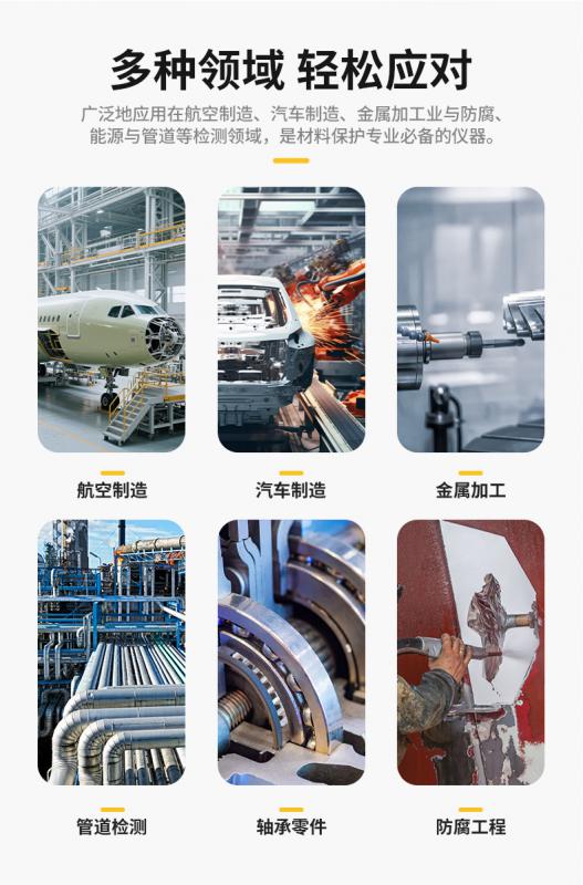 本儀器采用了磁性(標(biāo)配探頭)和渦流(選配探頭)兩種測(cè)厚方法,磁性探測(cè)法可無(wú)損地測(cè)量磁性金屬基體( 如鋼、鐵、合金和硬磁性鋼等 )上非磁性覆蓋層的厚度(如鋁、鉻、銅、油漆等), 渦流檢測(cè)法可測(cè)出非磁性金屬基材(如鋁、銅)上非導(dǎo)電覆蓋層的厚度(如鋁合金表面的氧化層、銅合金電鍍層等)。它能快速、無(wú)損傷、精密地進(jìn)行涂、鍍層厚度的測(cè)量。本儀器能廣泛地應(yīng)用在航空制造、汽車制造、金屬加工業(yè)與防腐、能源與管道等檢測(cè)領(lǐng)域,是材料保護(hù)專業(yè)必備的儀器