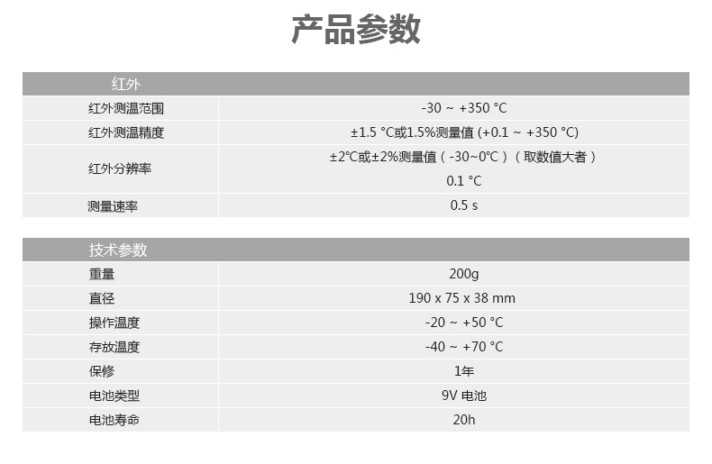 | 紅外測(cè)溫范圍 | -30 ~ +350 °C |