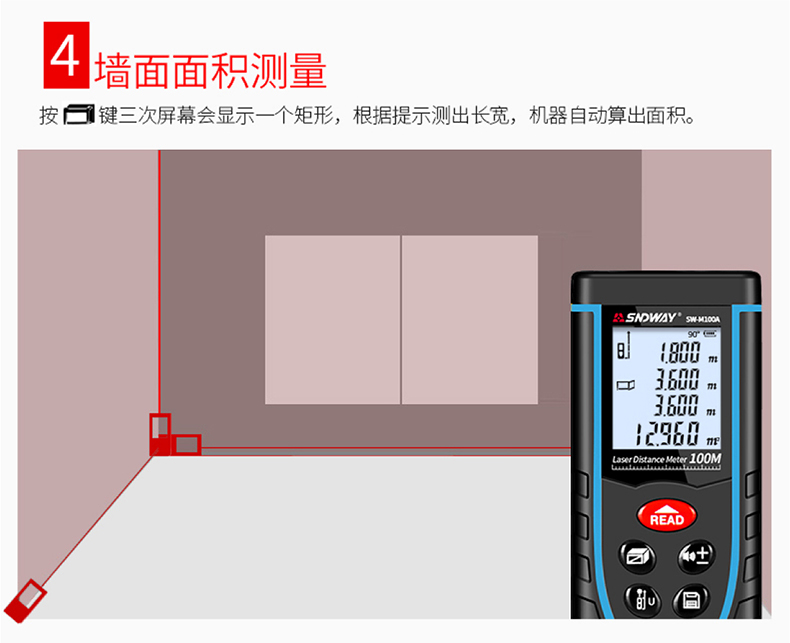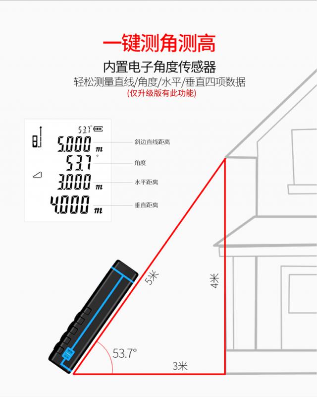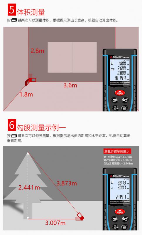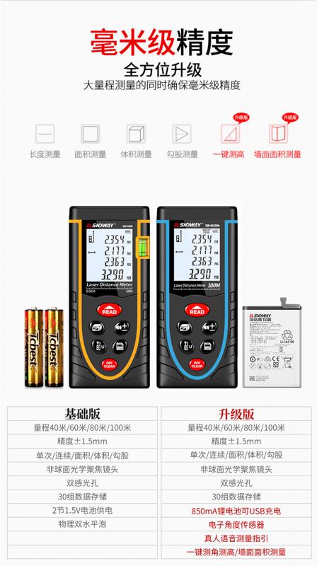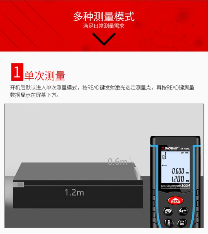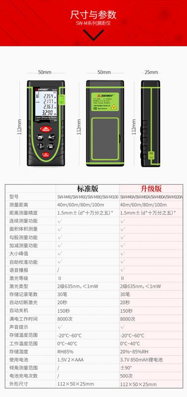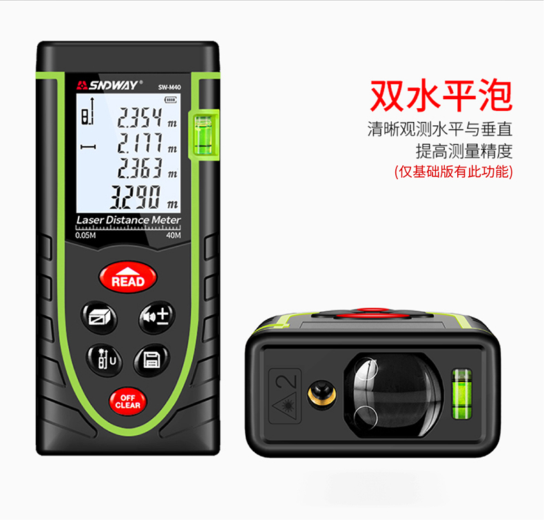 特點:M系列標(biāo)準(zhǔn)版測距儀采用雙水平泡,可以清晰觀測水平與垂直距離,提高測量精度,有30組數(shù)據(jù)存儲,多種測量模式,滿足日常測量需求