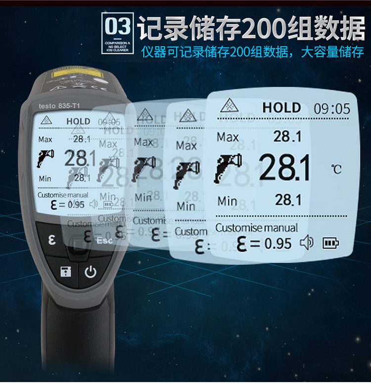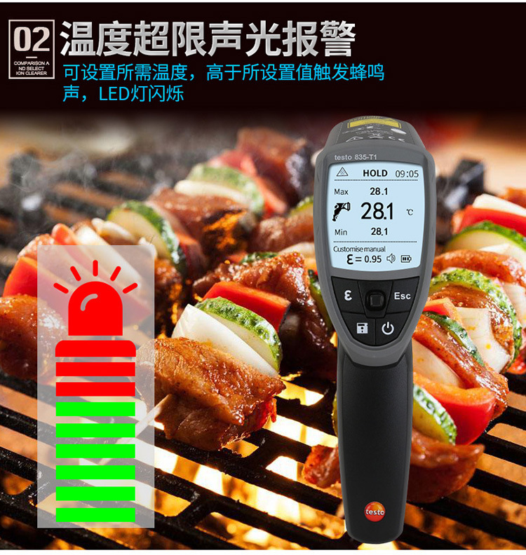testo 835-T1配備了一個(gè)易于操作的菜單,簡單明了的圖標(biāo)和人性化設(shè)計(jì)的操縱桿。您的紅外測溫儀可用于創(chuàng)建不同的測量站點(diǎn)或保存最多200組讀數(shù),附加功能包括顯示最大/最小值,可調(diào)整的閾值,當(dāng)閾值被突破時(shí),儀器會觸發(fā)聲光報(bào)警。免費(fèi)下載“EasyClimate”軟件,能為您提供一個(gè)分析測量數(shù)據(jù)的快速而便捷的方式。
