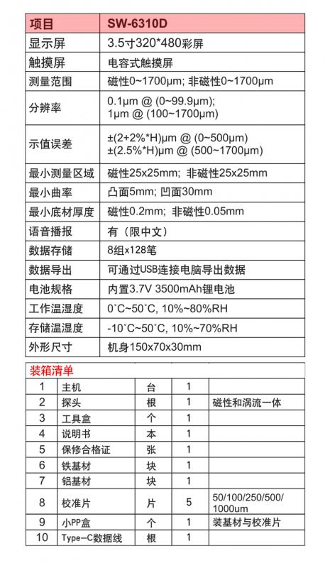 測量范圍:0-1700um,測量誤差:±(2+2%*H)μm @ (0~500μm),±(2.5%*H)um @ (500~1700um)