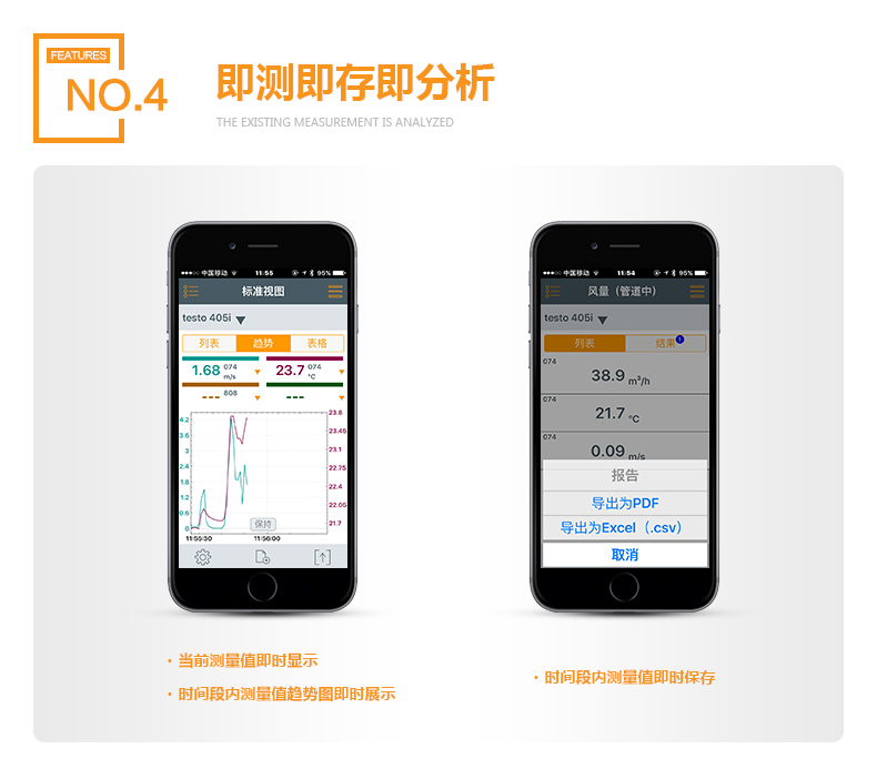 >>由于配備了德圖 Smart Probe APP,因而操作非常方便(例如,可以方便地查看文本、測量數(shù)據(jù)趨勢以及記錄功能)