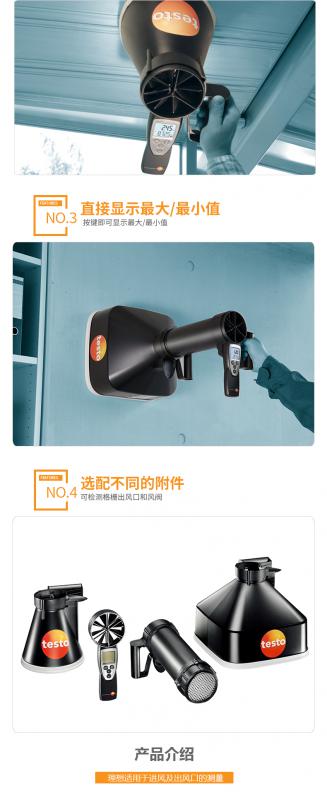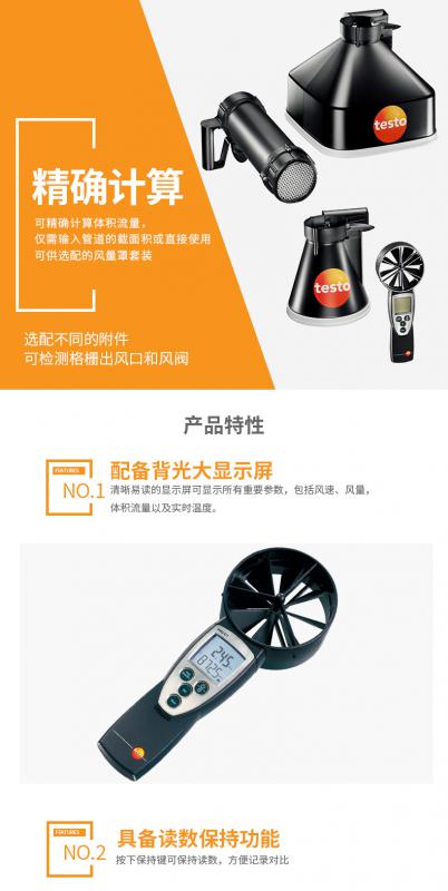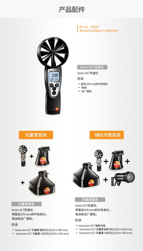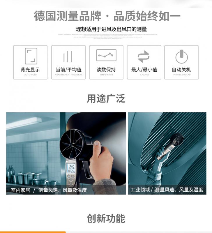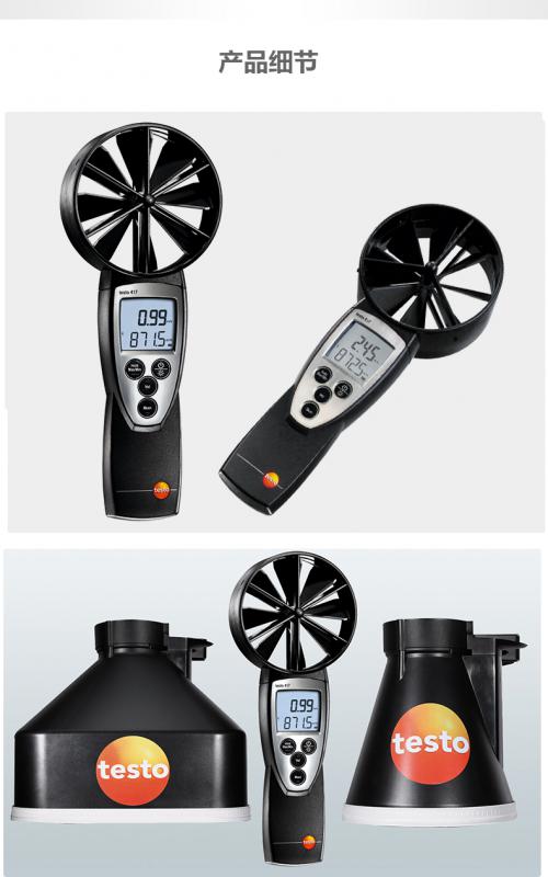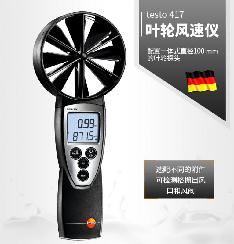 testo 417葉輪風速儀適用于進風及出風口的快速又精確的風速測量。清晰易讀的顯示屏上可顯示風速、溫度、體積流量及氣流方向。該風速計還帶時間段和多點平均值計算功能計算,按鍵即可顯示最大/最小值。