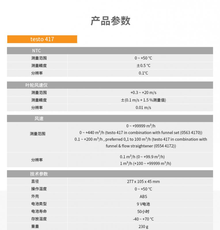 0.1 ~ +200 m/h , preferred 0,1 to 100 m/h (testo 417 in combination with funnel & flow straightener (0554 4172))