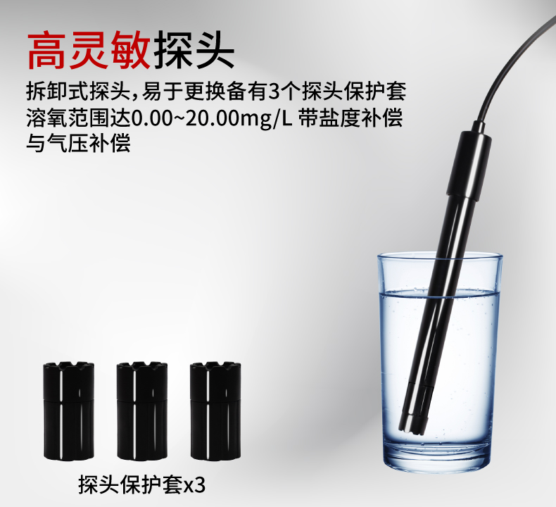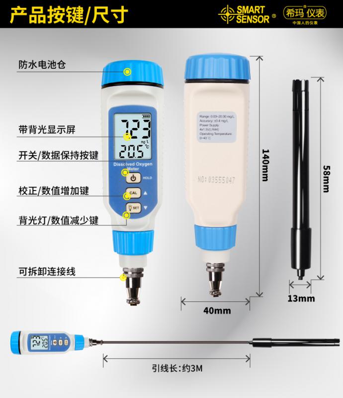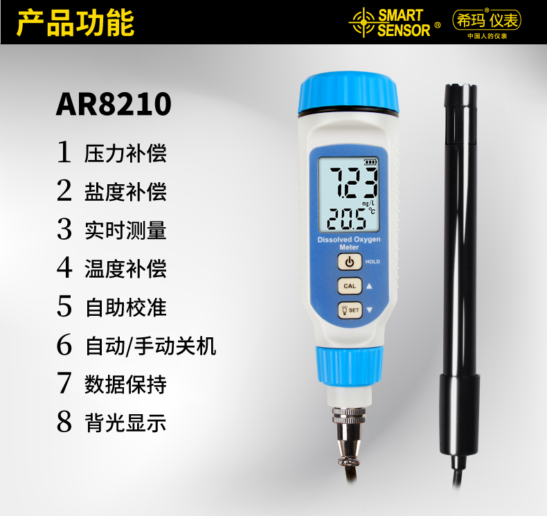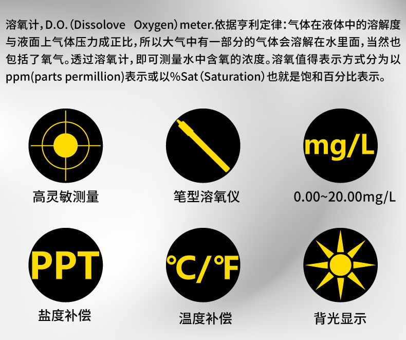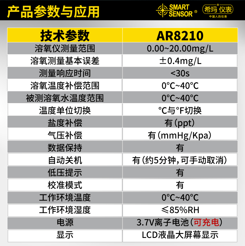 量程:0~20mg/L,基本誤差:±0.4mg/L,響應時間:<30s,有溫度、鹽度和氣壓補償