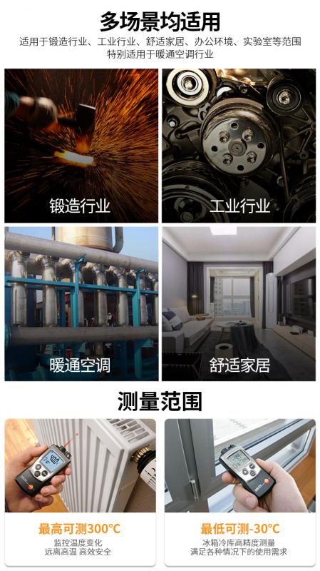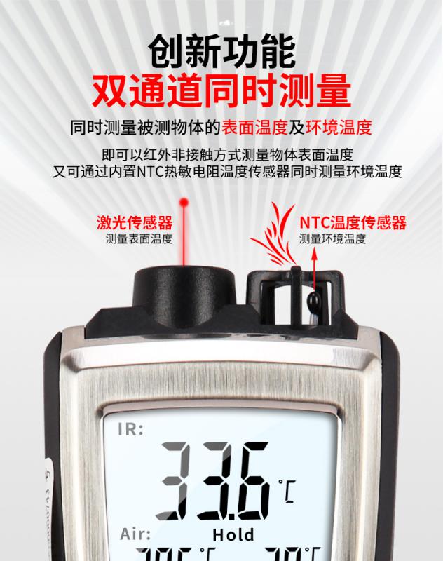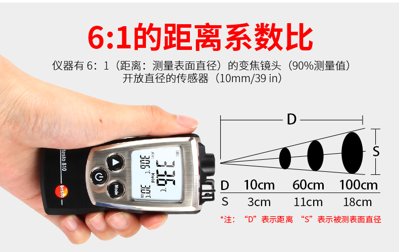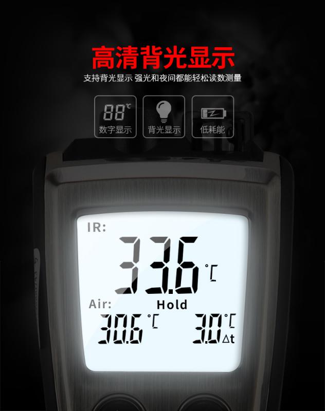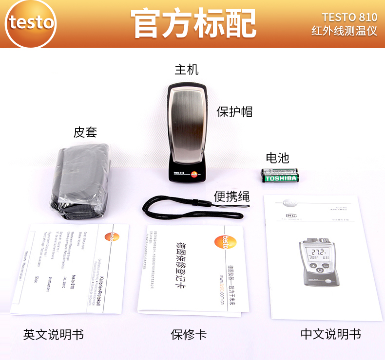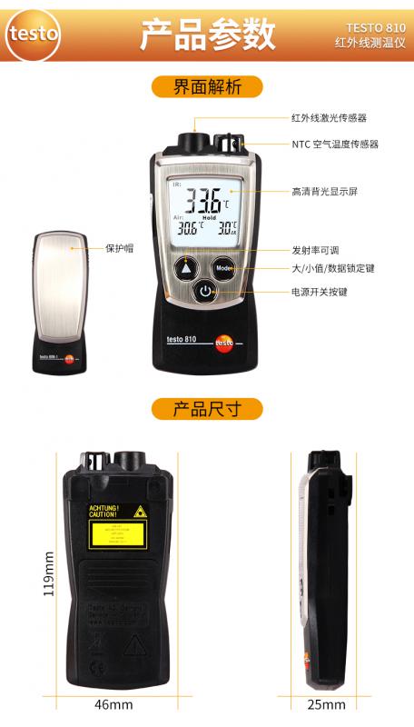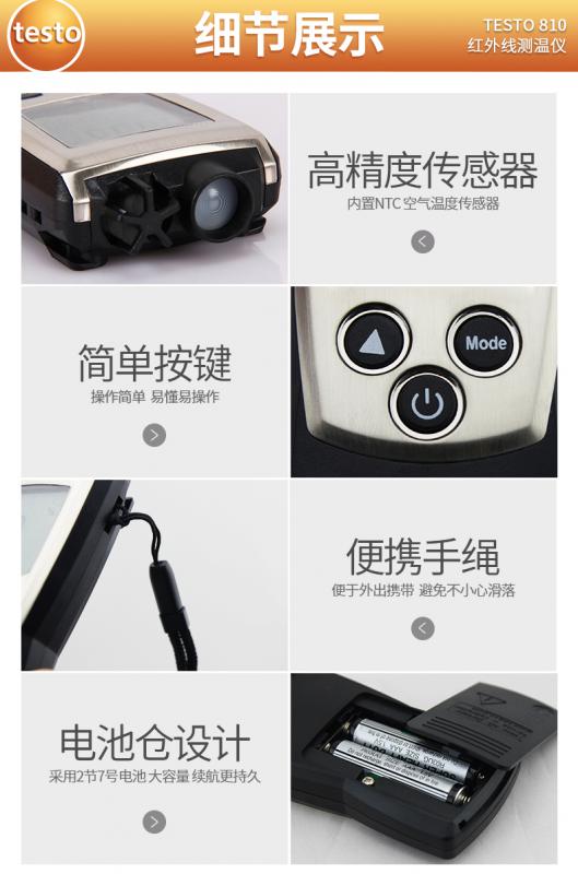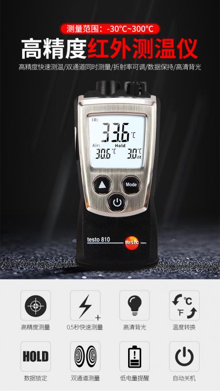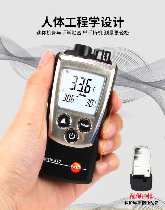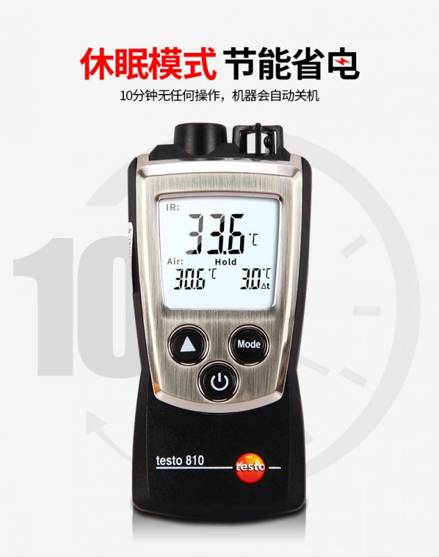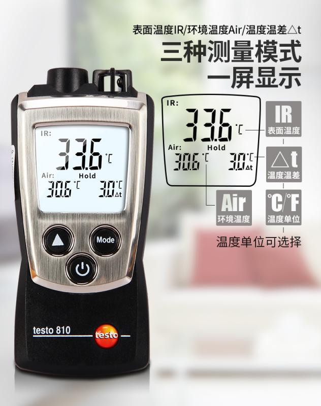 testo810紅外線測溫儀,雙通道測溫,即可以紅外非接觸方式測量物體表面溫度,又可通過內(nèi)置NTC熱敏電阻溫度傳感器同時測量空氣溫度,并自動進(jìn)行溫差計算并直接顯示于帶背光燈的顯示屏上。