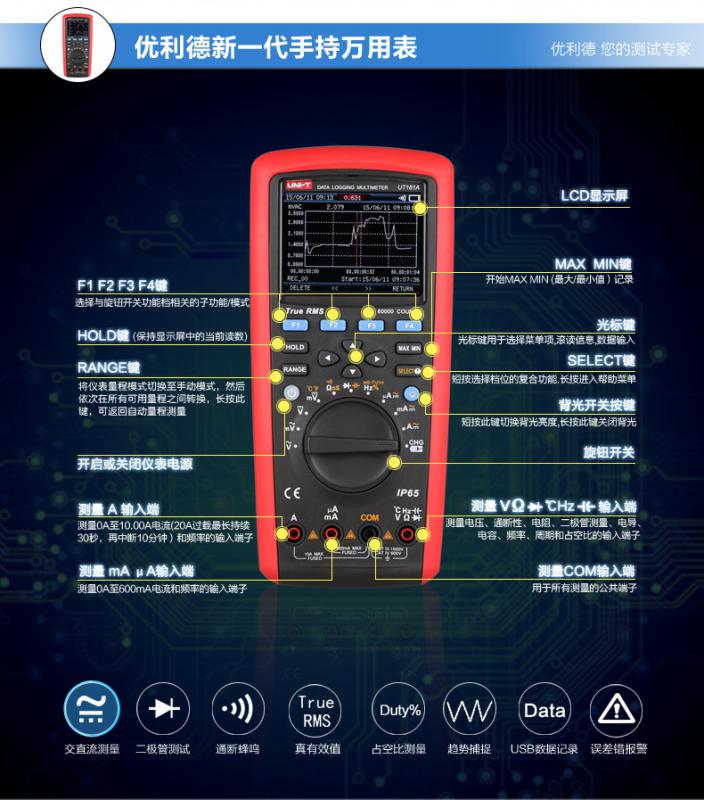 UT181A是一款具有趨勢捕獲功能、真有效值、低通濾波、nS電導(dǎo)、雙溫度測量等眾多全能型數(shù)字萬用表,可以滿足大多數(shù)用戶以及應(yīng)用場合的需求。