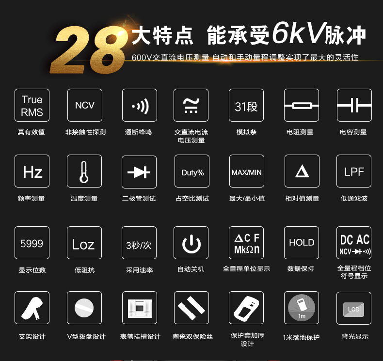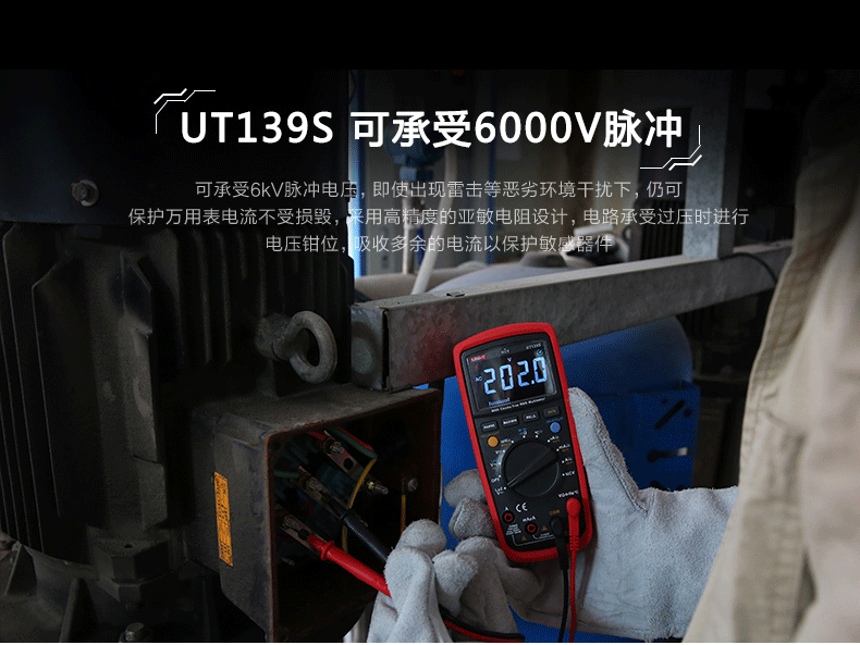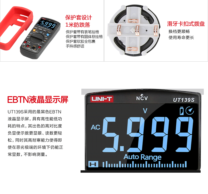 UT139S真有效值(True Rms)萬用表是專為電工行業(yè)設(shè)計(jì)的萬用表,配置低通濾波(LPF)功能,能過濾正弦波疊加的載頻干擾、諧波干擾電壓等信號(hào),配置LoZ(低阻抗輸入)可用于測(cè)試工頻虛假電壓,配置31段模擬條,便于快速觀察測(cè)試結(jié)果的變化過程。