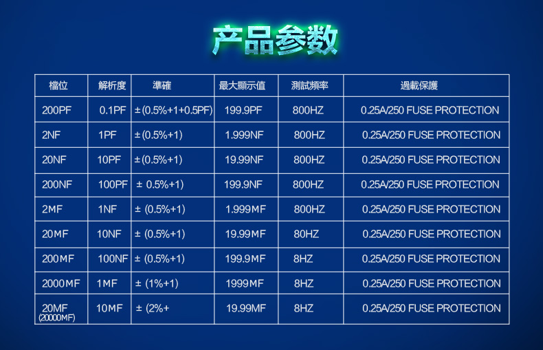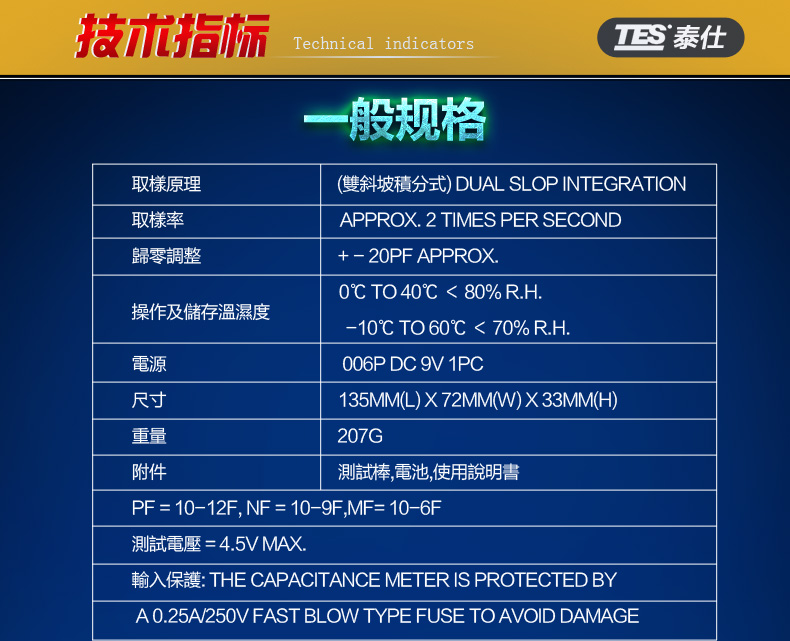 精確度0.5%,過載保險絲保護,使用測棒或直接插入測試即可