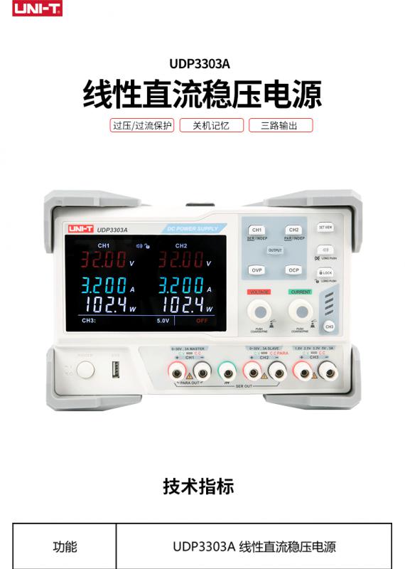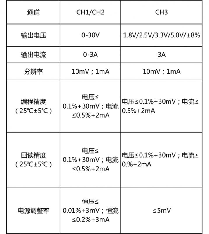 輸出電壓:0-30V;輸出電流:0-3A;分辨率:10mv;1mA