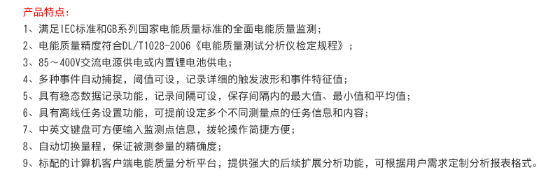 交流電壓:0.1~1000V,交流電流:3000A柔性電流探頭,功率/電能:9000KW,工頻頻率:45~65Hz,相位角:0~359.99°,閃變:0.00~20.00