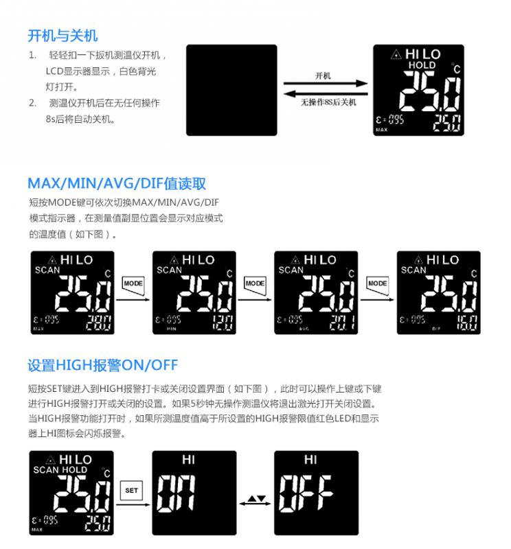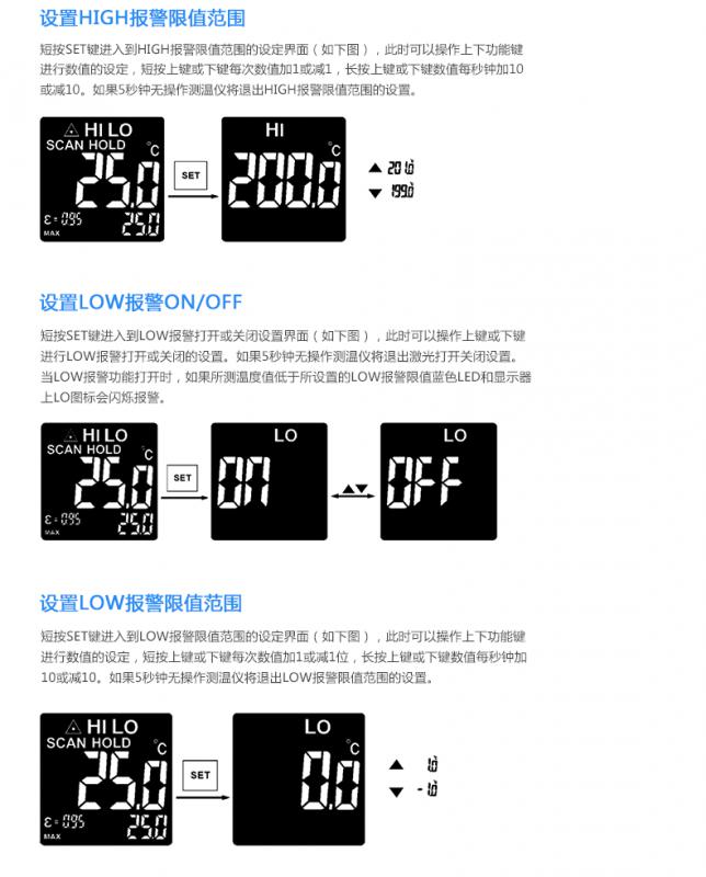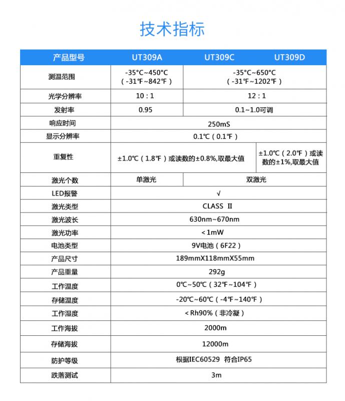 測溫范圍:-35~450℃,顯示分辨率:0.1℃,D:S:10:1,發(fā)射率0.95,激光類型:2類,激光功率<1mW
