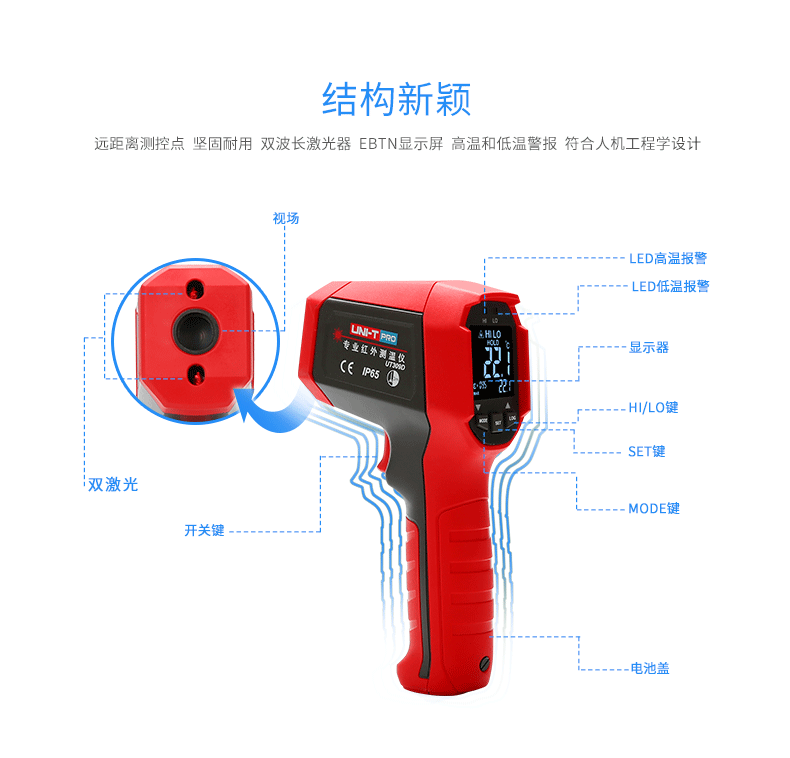 測(cè)溫范圍:-35~600℃,顯示分辨率:0.1℃,D:S:12:1,發(fā)射率0.10~1.0可調(diào),激光類型:2類,激光功率<1mW