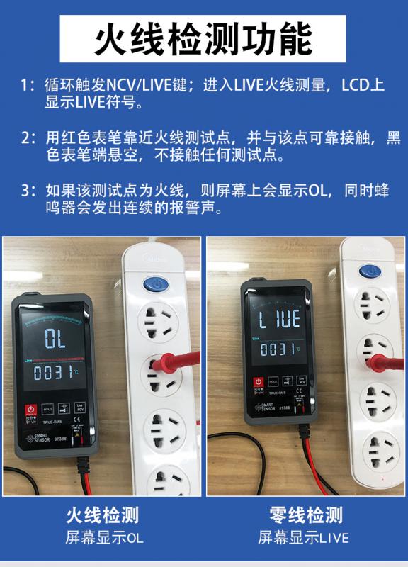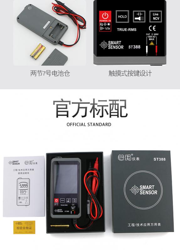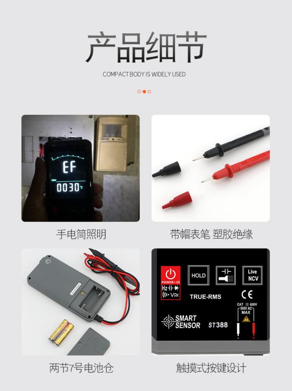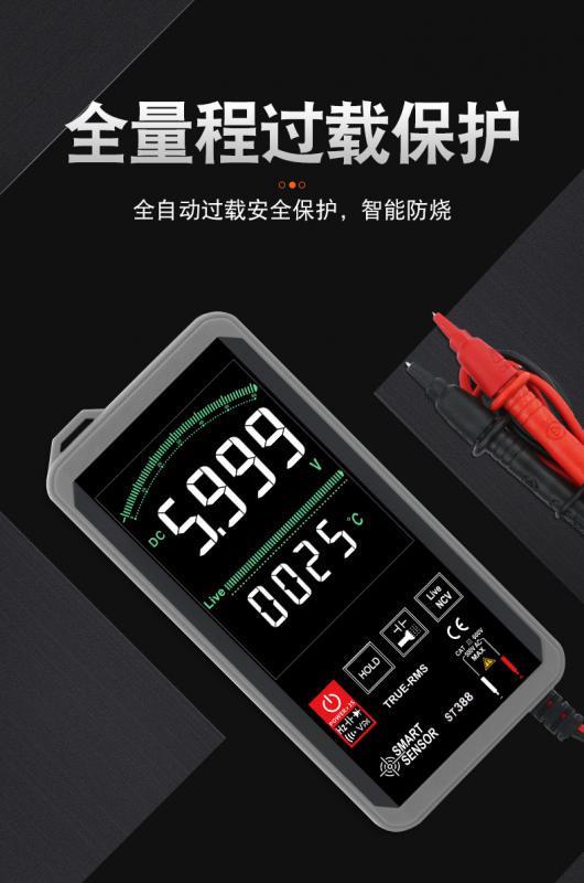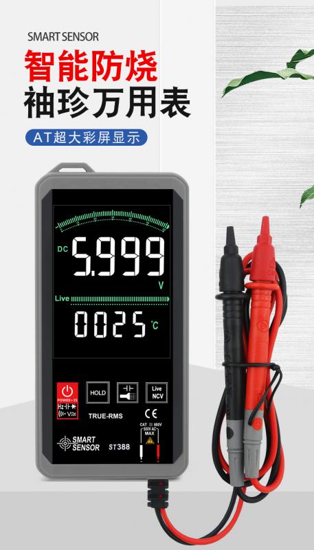 ST388是一款袖珍型3 5/6位口袋型真有效值智能掃描數(shù)字儀表;該系列為三重顯示:主顯示,副顯示,模擬棒條。除交流電壓測量副顯示頻率外,其它功能副顯示為常溫,用戶在使用過程中,真正做到操作不斷電,不需要轉(zhuǎn)動(dòng)撥盤去選擇功能,根據(jù)輸入的 / 的不同會(huì)進(jìn)行自動(dòng)識(shí)別測量,該機(jī)性能 交直流電壓 電阻穩(wěn)定、高精度、高可靠性、讀數(shù)清晰、過載保護(hù)功能。用AAA 1.5V電池驅(qū)動(dòng),該系列儀表采用TA超大彩屏幕LCD 顯示器,采用升壓供電,即使在2.3V低電池邊緣也能保證背光及手電筒的超高亮度,該表攜帶方便,是一款廣大用戶極其喜歡的儀表