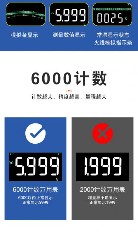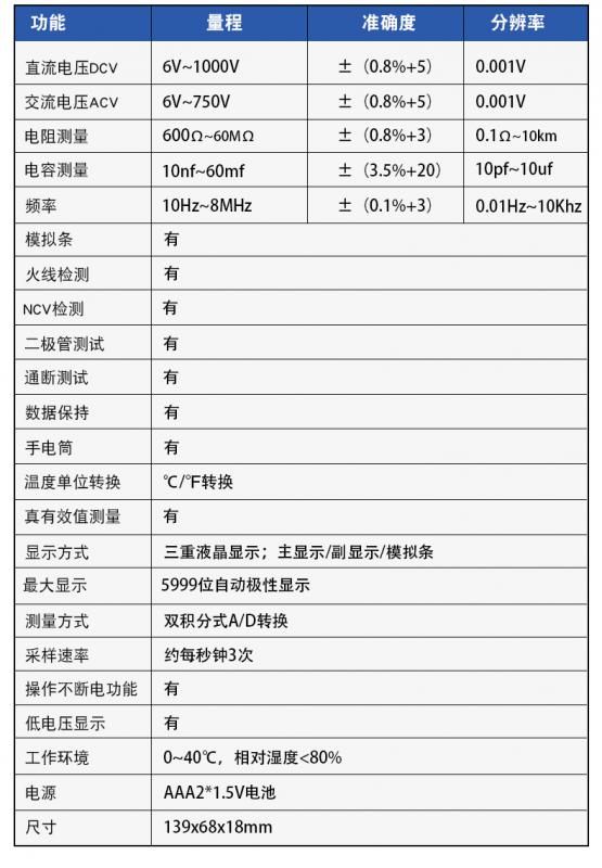| 交流電壓ACV | 量程:6~750V 精度:±0.8%±5 分辨率:0.001~1V |