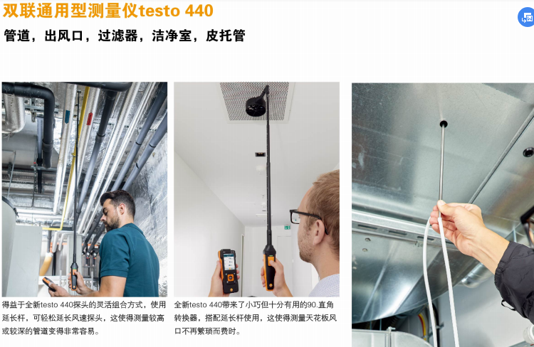 通風(fēng)管道中的測量,使用熱線風(fēng)速探頭(配備兼容的測量儀)測量風(fēng)速、風(fēng)量和空氣溫度。