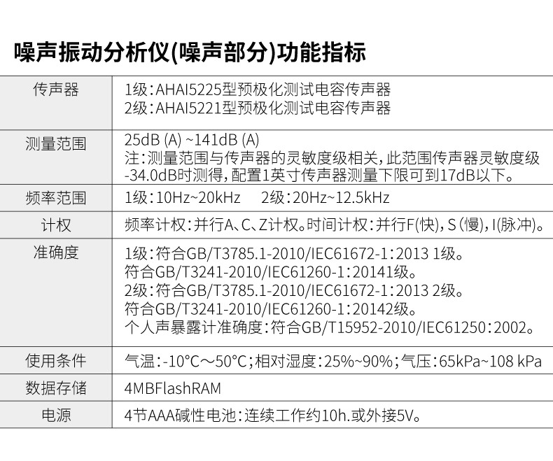1級:符合 GB/T 3785.1-2010/IEC 61672-1:2013 1級。 符合 GB/T 3241-2010/IEC 61260-1:2014 1級 2級:符合 GB/T 3785.1-2010/IEC 61672-1:2013 2級 符合 GB/T 3241-2010/IEC 61260-1:2014 2級 個人聲暴露計準確度:符合GB/T 15952-2010 / IEC 61250:2002 |
